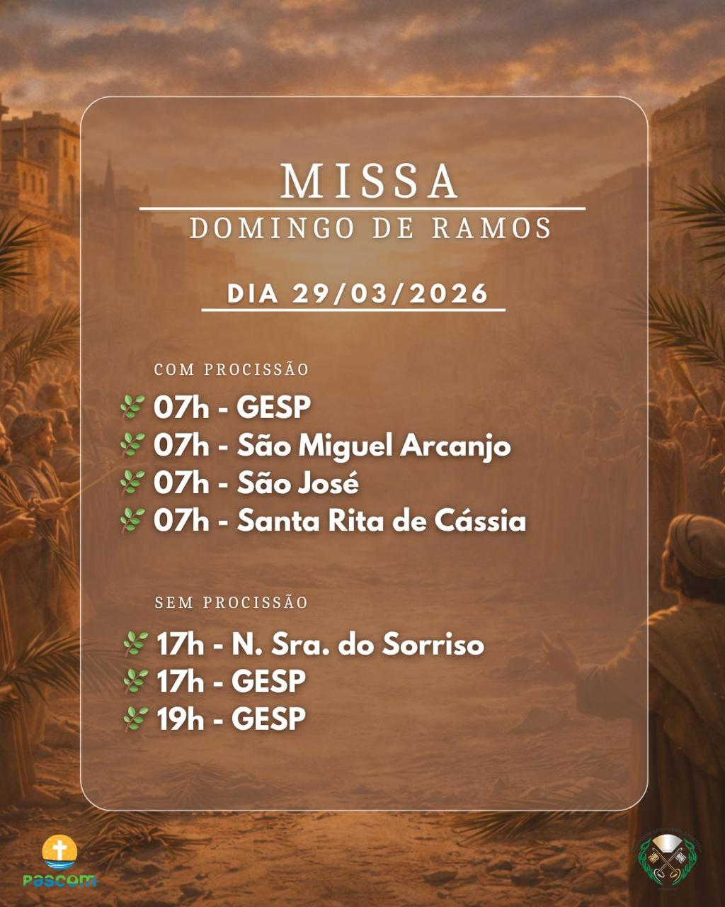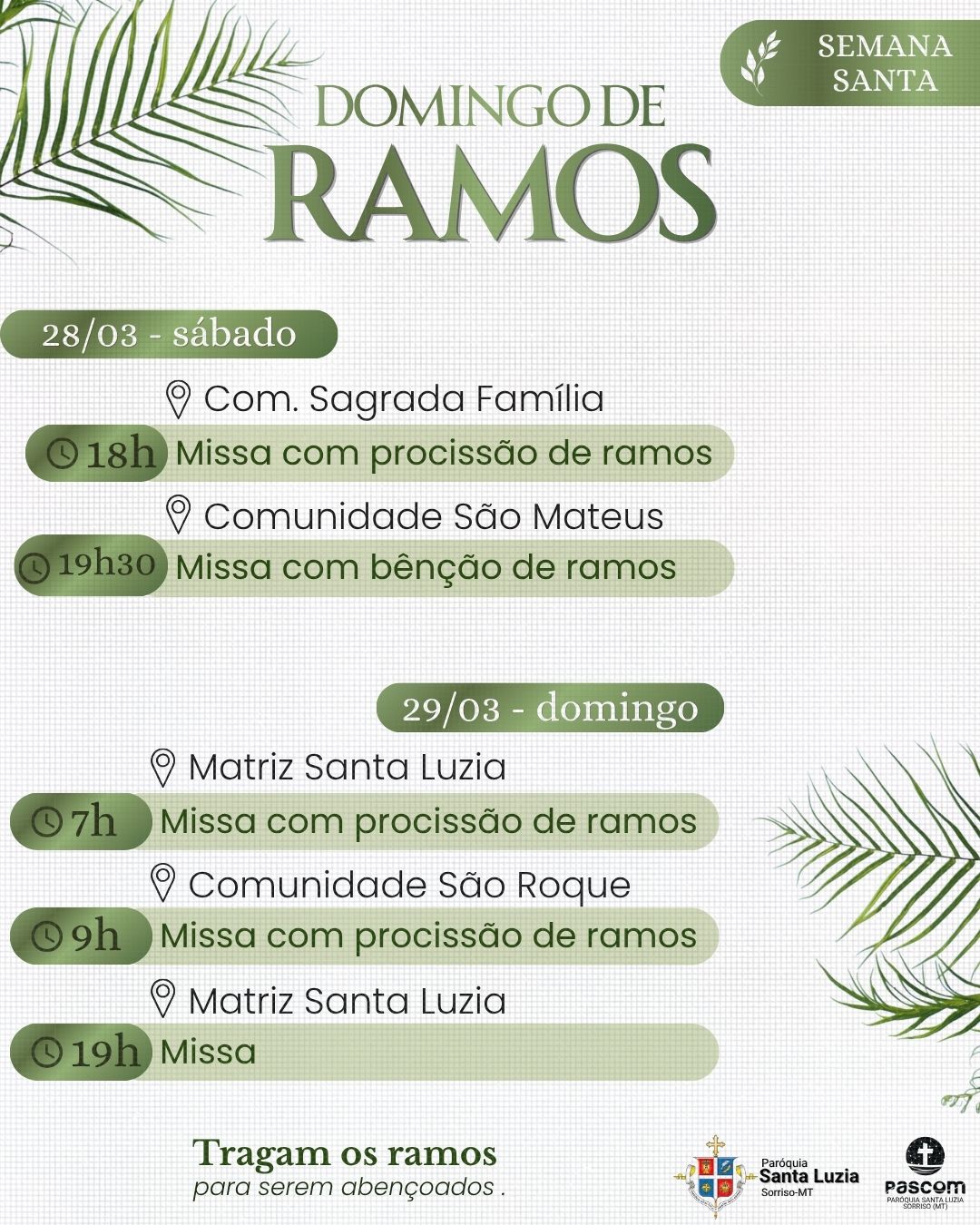 No domingo (29), as atividades começam cedo. Às 7h, na Igreja Matriz Santa Luzia, haverá procissão saindo em frente ao Lar São Francisco, seguida de celebração. Às 9h, a comunidade São Roque também realiza missa com procissão de ramos. Já no período da noite, haverá celebração às 19h, porém sem bênção ou procissão de ramos, sendo orientado que os fiéis levem seus ramos previamente.