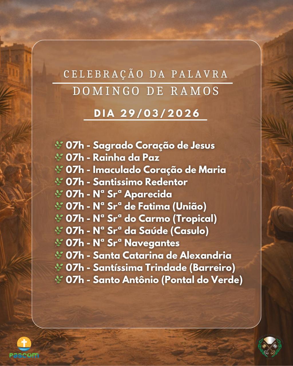 De acordo com o padre Valdivino, da Paróquia Santa Luzia, a programação inicia já no sábado (28), com celebração às 18h na comunidade Sagrada Família, no bairro Mário Raiter, com procissão de ramos. Ainda no sábado, haverá missa às 19h30 na comunidade São Mateus.