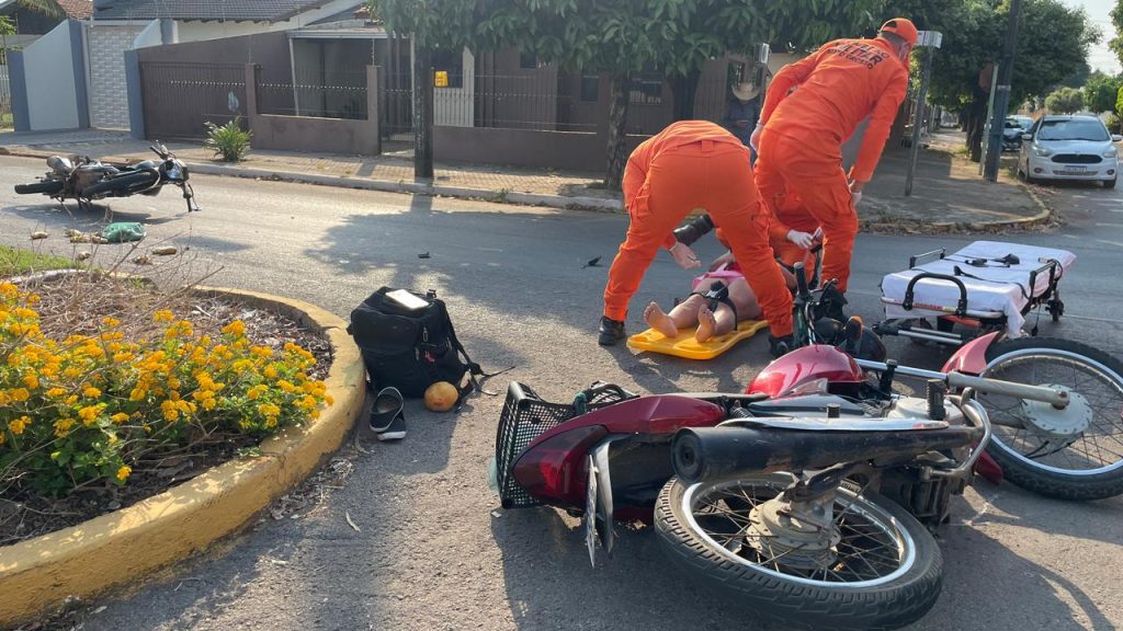 Duas pessoas ficaram feridas em um acidente envolvendo motocicletas na manhã desta quarta-feira (8) na Avenida Curitiba com a Rua Nápolis, no Jardim Itália, e foram encaminhadas à UPA pelos Bombeiros, sem complicações graves.