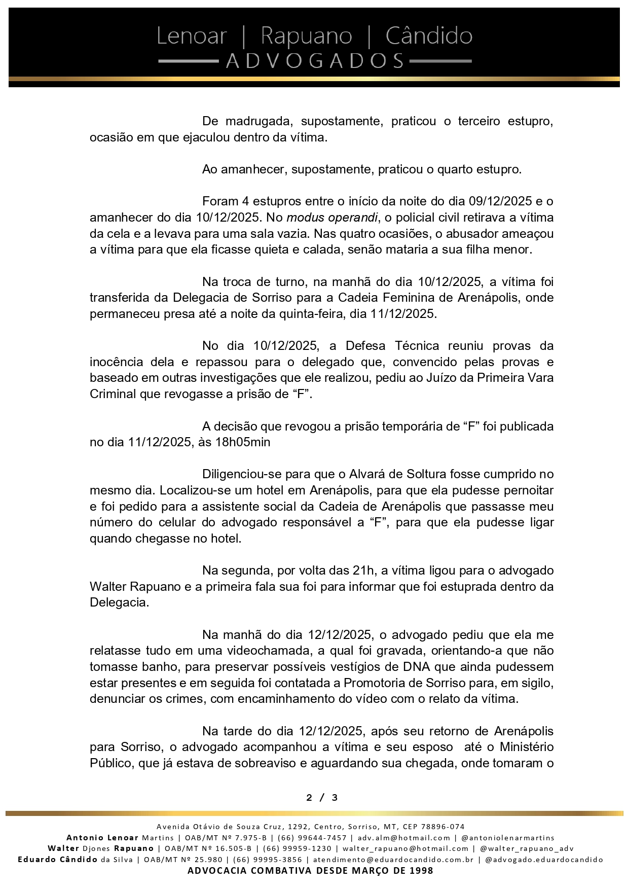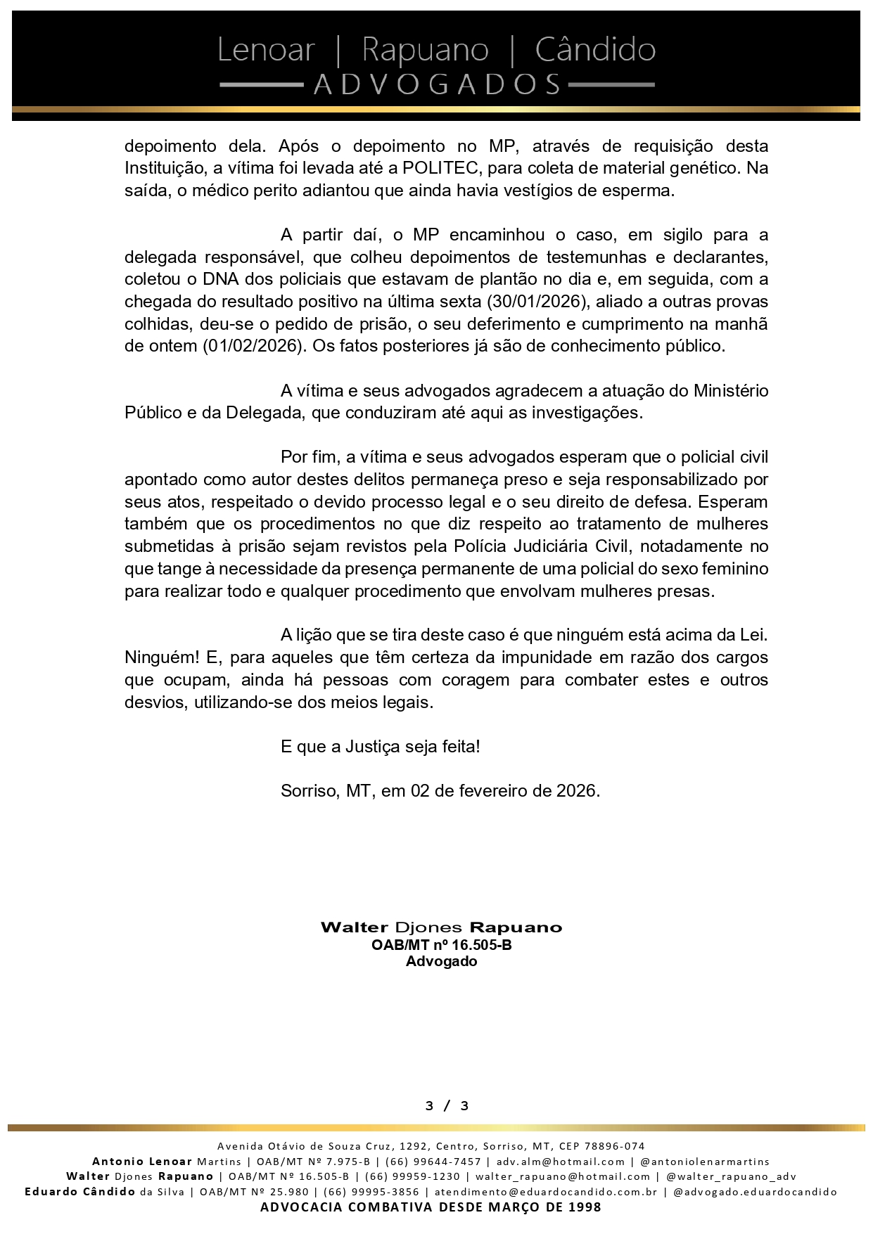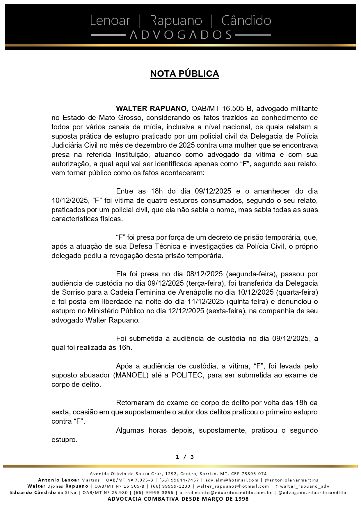 O advogado Walter Djones Rapuano, do escritório Leonar Rapuano Cândido Advogados, publicou uma nota pública nesta semana detalhando denúncias graves de violência sexual supostamente praticadas por um policial civil contra uma mulher que estava sob custódia do Estado, em Sorriso.