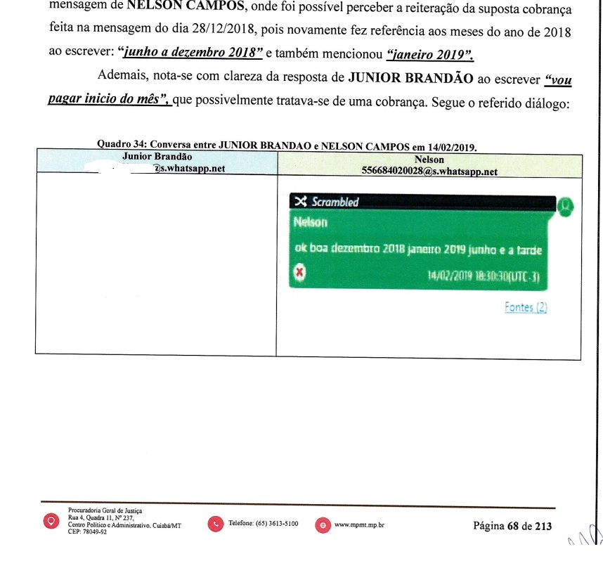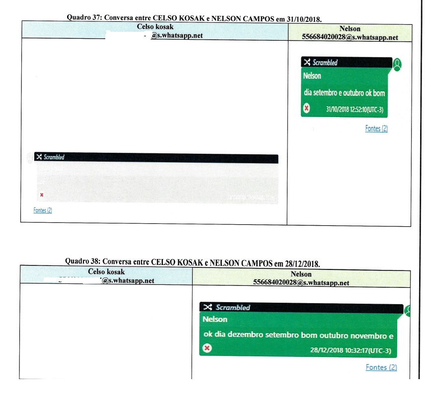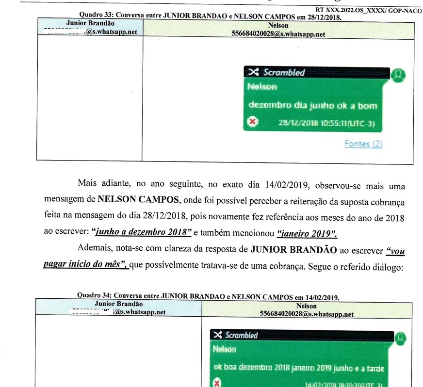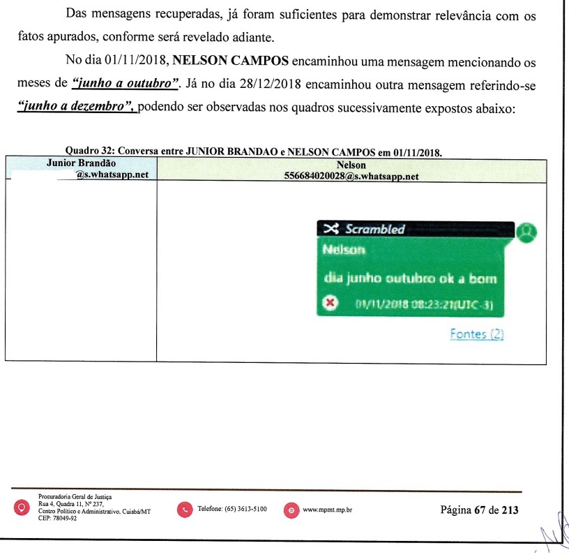 O inquérito destaca que as mensagens haviam sido apagadas, mas foram recuperadas pela ferramenta Cellebrite Ufed. Destaca que “das mensagens recuperadas, foram suficientes para demonstrar relevância com os fatos apurados […] No dia 01/11/2018, Nelson Campos encaminhou uma mensagem mencionando os meses de ‘junho a outubro’. Já no dia 28/12/2818, encaminhou outra mensagem referindo-se a ‘junho a dezembro’.