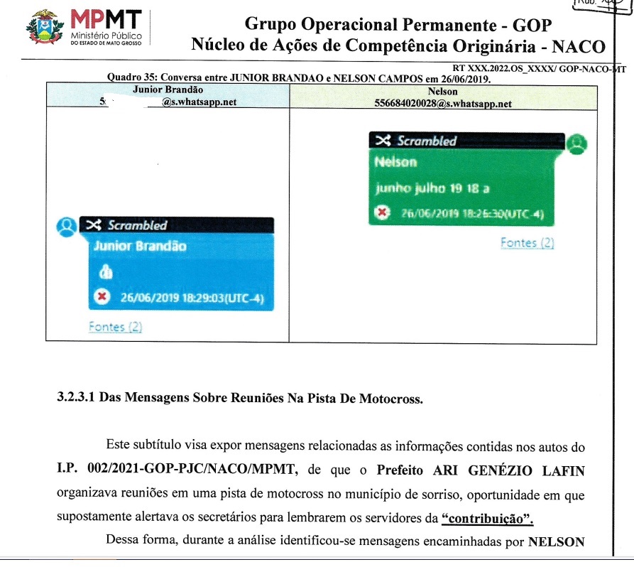 Alguns dos secretários, sub-secretários e outros apontados nas investigações do Ministério Público relacionadas ao esquema de rachadinha na Prefeitura Municipal de Sorriso continuam nos cargos. Um deles é o secretário de Esportes Junior Brandão, que foi cobrado por meio de mensagens via WhatsApp por Nelson Campos.