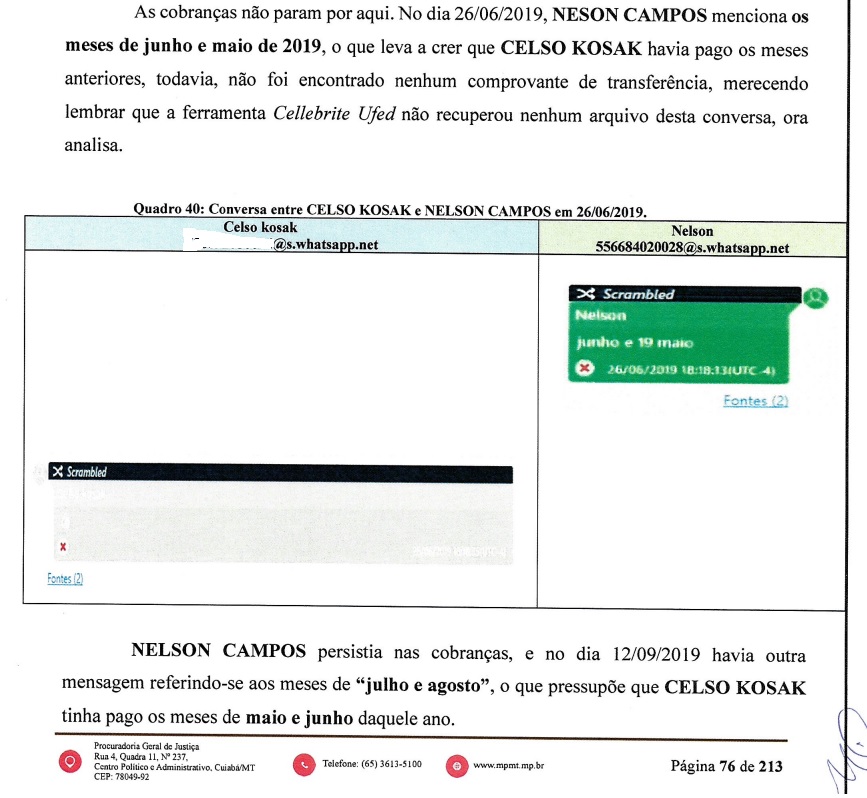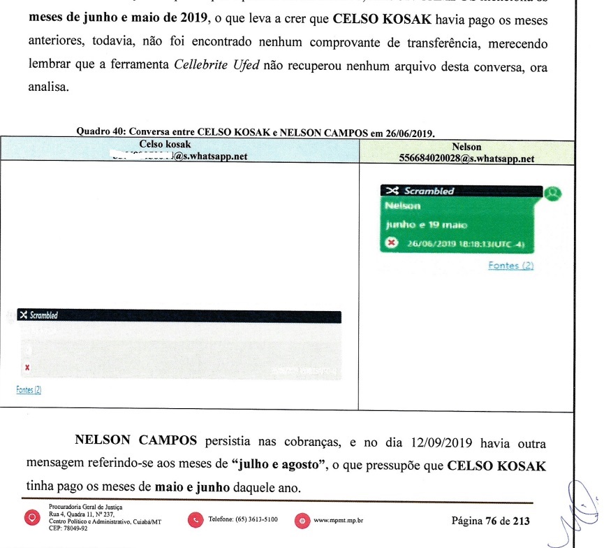 O texto do inquérito segue narrando que as cobranças seguiram no dia 26/06/2019, com Nelson Campos mencionando para Celso Kosak os meses de junho e maio de 2019 “o que leva a crer que Celso Kosak havia pago os meses anteriores, todavia, não foi encontrado nenhum comprovante de transferência, merecendo lembrar que a ferramenta Cellebrite Ufed não recuperou nenhum arquivo desta conversa”.