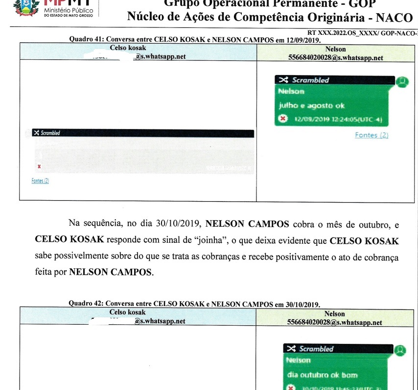 Destaca ainda o texto que “Nelson Campos seguia nas cobranças e que no dia 12/09/2019 havia outra mensagem referindo-se aos meses de ‘julho e agosto’, o que pressupõe que Celso Kosak tinha pago os meses de maio e junho daquele ano”.