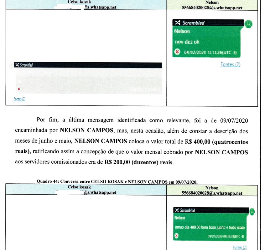 “Por fim, a última mensagem identificada como relevante, foi a de 09/07/2020, encaminhada por Nelson Campos, mas nesta ocasião, além de constar a descrição dos meses de junho e maio, Nelson Campos coloca o valor total de R$ 400,00 (quatrocentos reais), ratificando assim a concepção de que o valor mensal cobrado por Nelson Campos aos servidores comissionados era de R$ 200,00”.