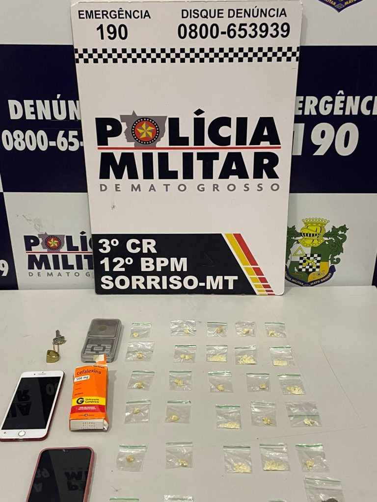 Durante a busca, foram localizados 27 invólucros de pasta-base de cocaína, além de porções de cocaína, maconha, uma balança de precisão e diversos sacos tipo zip lock usados para embalar drogas.