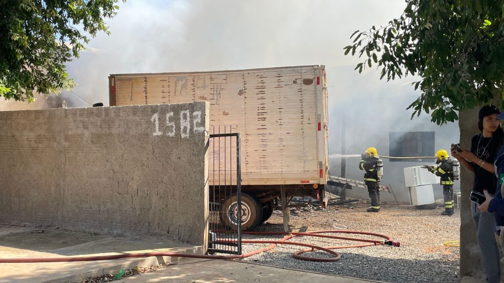 No bairro Rota do Sol, um incêndio foi controlado pelo Corpo de Bombeiros na manhã desta segunda-feira (29) após as chamas atingirem uma residência e também um caminhão.
