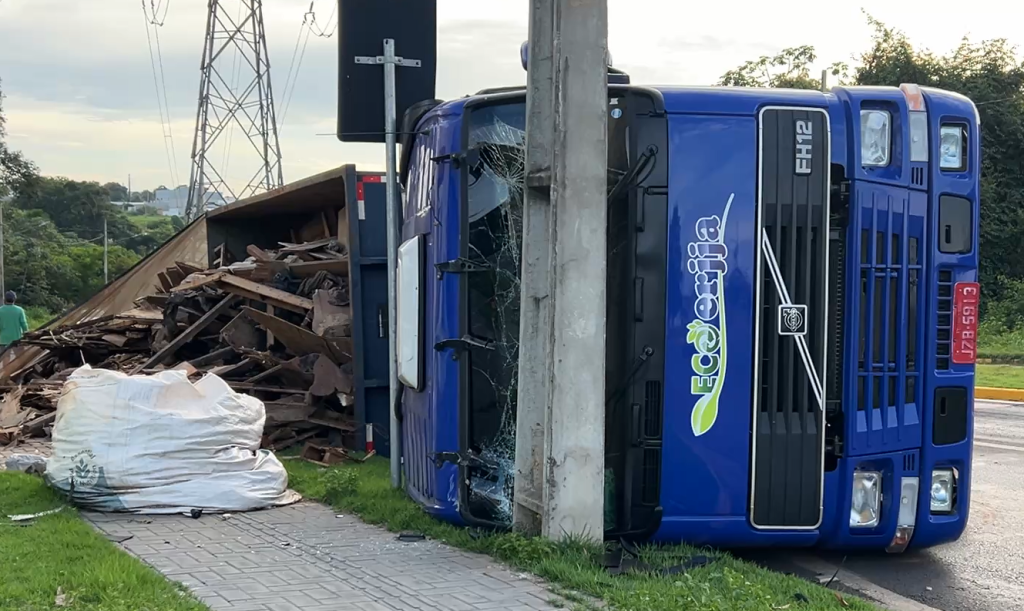 Na manhã desta quinta-feira (20), um acidente foi registrado na avenida Porto Alegre, no bairro Monte Líbano, resultando em prejuízo significativo para o proprietário do veículo. O caminhão estava carregado de entulhos.