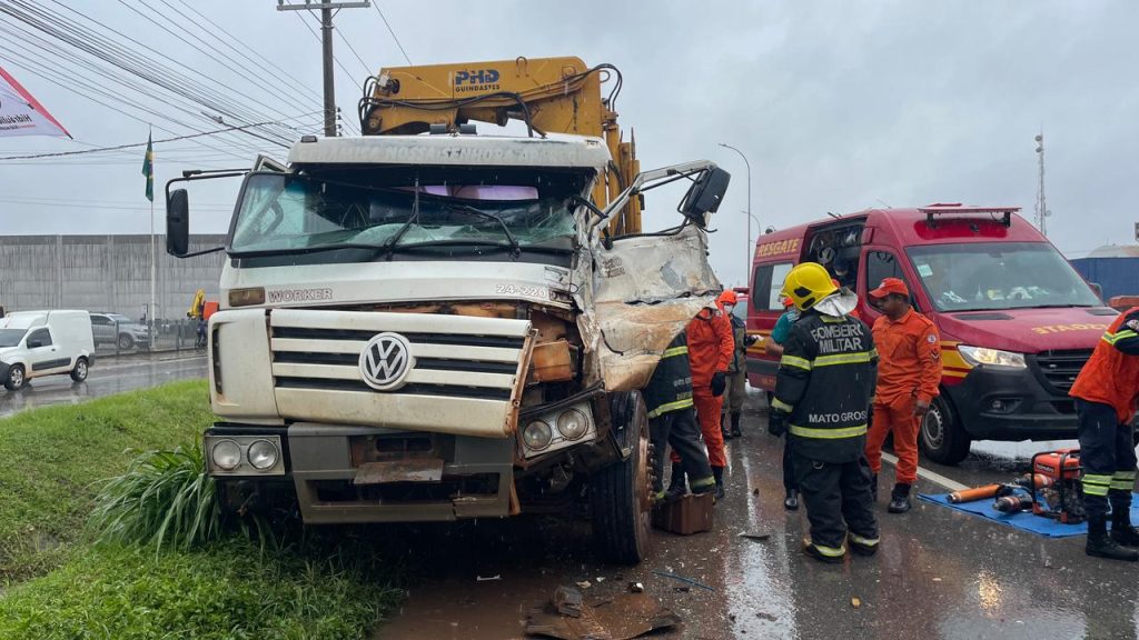 Um acidente envolvendo dois caminhões foi registrado na tarde desta segunda-feira (02) na BR-163 e mobilizou equipes do Corpo de Bombeiros de Sorriso. A colisão deixou o condutor de um caminhão munck preso no interior do veículo, com o corpo travado pelo volante.