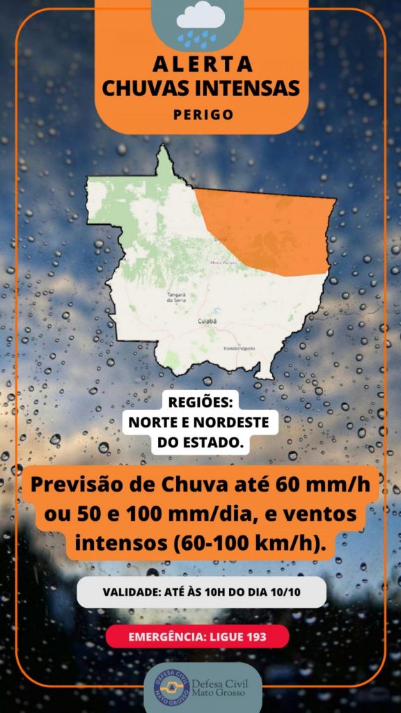 A Coordenadoria Municipal de Proteção e Defesa Civil (Compdec) de Sorriso emitiu nesta quinta-feira (09.10) um alerta de temporais, com previsão de chuvas intensas e ventos fortes até às 10h desta sexta-feira (10). O aviso traz uma série de recomendações à população para antes, durante e após a ocorrência das tempestades.