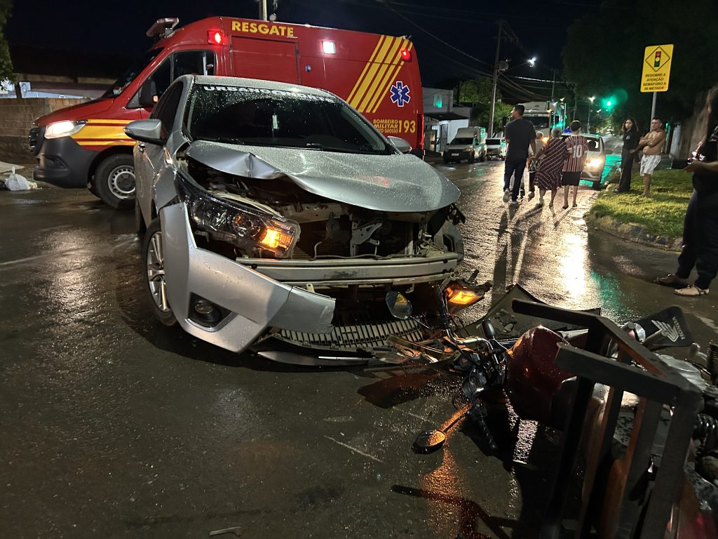Um acidente de trânsito foi registrado na noite desta sexta-feira (26), no bairro Nova Aliança, zona leste da cidade. A colisão ocorreu no cruzamento entre as ruas Iguaçu e Rio Negro, envolvendo um carro modelo Corolla e uma motocicleta de entrega.