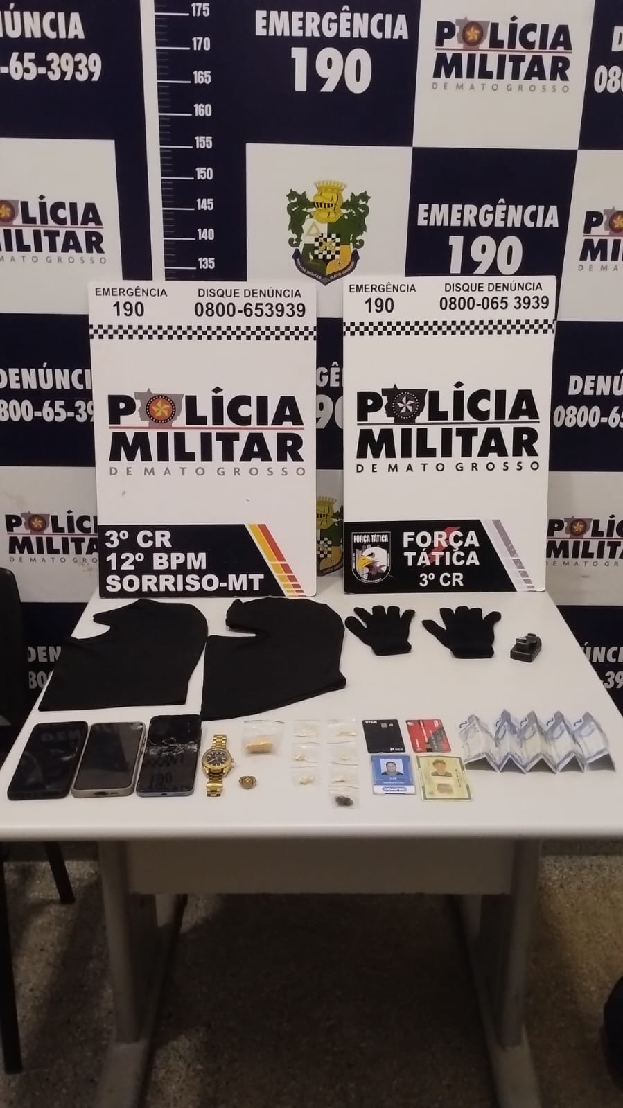 Durante a abordagem, os policiais também localizaram um relógio dourado, três anéis da mesma cor e cerca de 15 gramas de pasta base de cocaína. Todo o material, juntamente com os suspeitos, foi encaminhado à Delegacia de Polícia Civil, onde o caso continua sendo investigado.