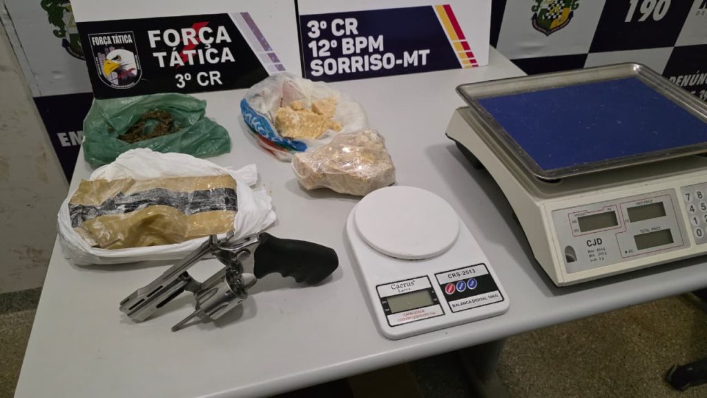 Através do setor de inteligência da Polícia Militar, a equipe da Força Tática prendeu um homem de 21 anos, na tarde de quinta-feira (12), em Sorriso, no bairro Jardim Primavera. Na residência, foram encontradas várias porções de entorpecentes, além de uma arma de fogo.
