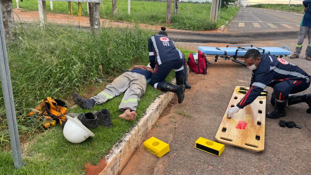 De acordo com a enfermeira Nara Morais, da equipe do SAMU, a vítima foi encontrada consciente e orientada no local. O próprio trabalhador relatou que caiu de uma altura aproximada de três metros. “Ele estava em solo, orientado. Disse que caiu da escada de cerca de três metros. Estava utilizando EPI, porém o cinto de segurança acabou se rompendo”, explicou.