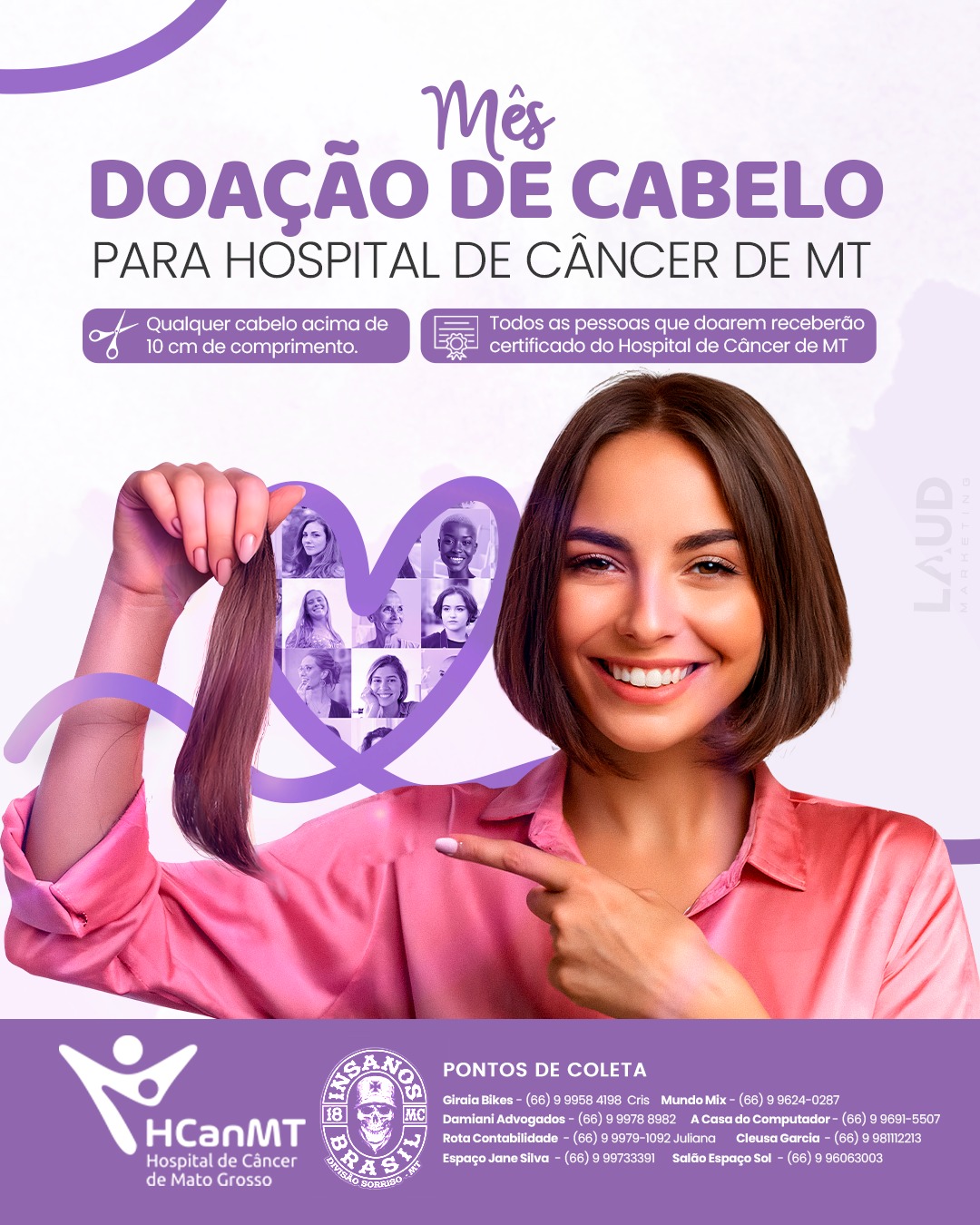 Durante todo o mês de agosto acontece a campanha de doação de cabelo em prol do Hospital de Câncer de Mato Grosso, incentivando a arrecadação de mechas a partir de 10 centímetros para a confecção de perucas destinadas a pacientes em tratamento oncológico.