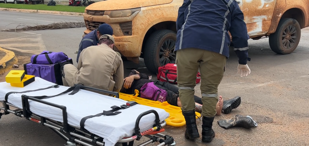 Informações preliminares apontam que a caminhonete teria invadido a via preferencial, causando a colisão. A vítima recebeu os primeiros atendimentos no local e foi encaminhada para uma unidade de saúde para avaliação médica.