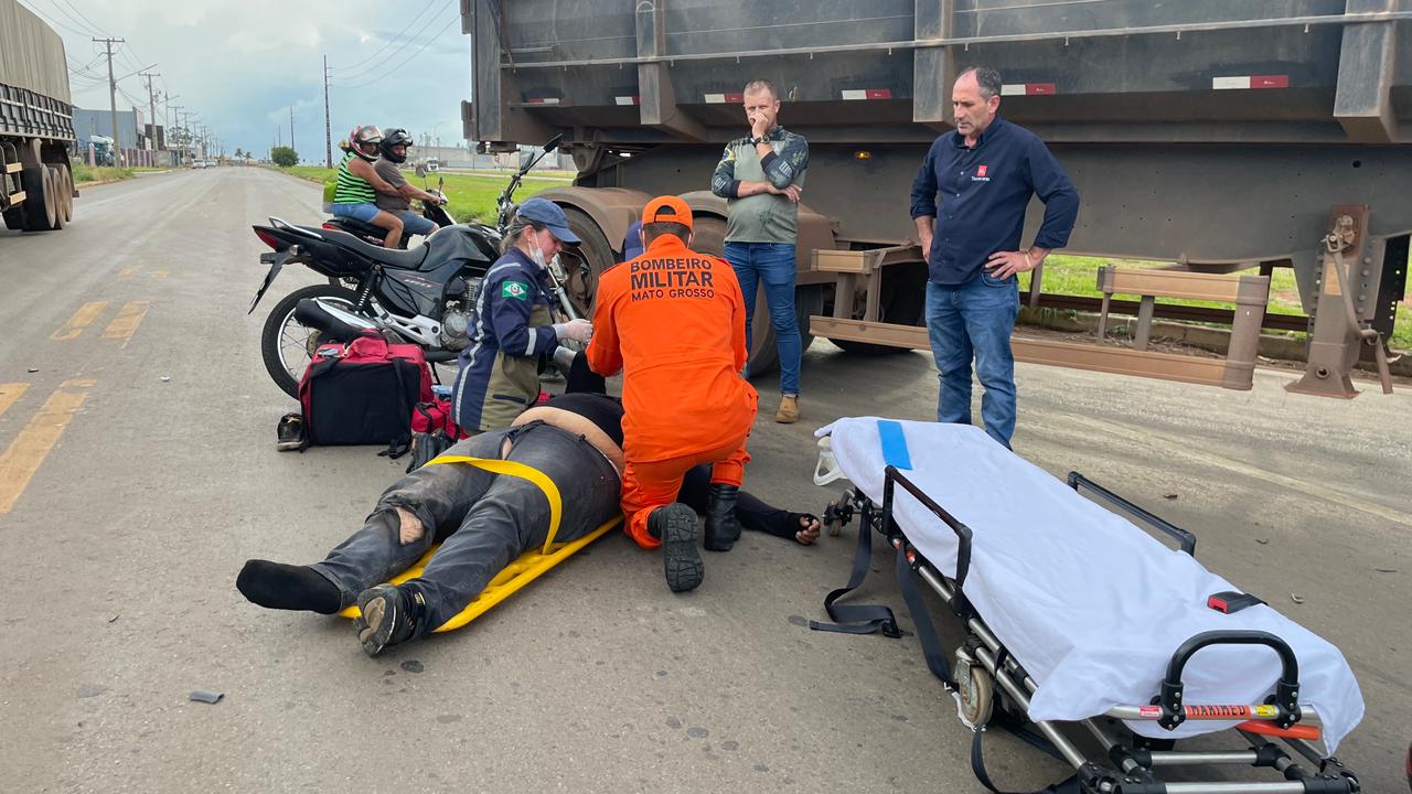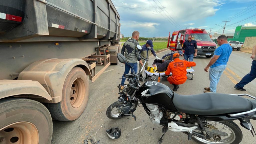 Um motociclista de 27 anos ficou gravemente ferido após colidir com uma carreta na tarde desta segunda-feira (14), na Perimetral da BR-163, em Sorriso. O Corpo de Bombeiros foi acionado via 193 e encontrou o jovem caído ao solo, com fraturas evidentes na perna esquerda e no punho.