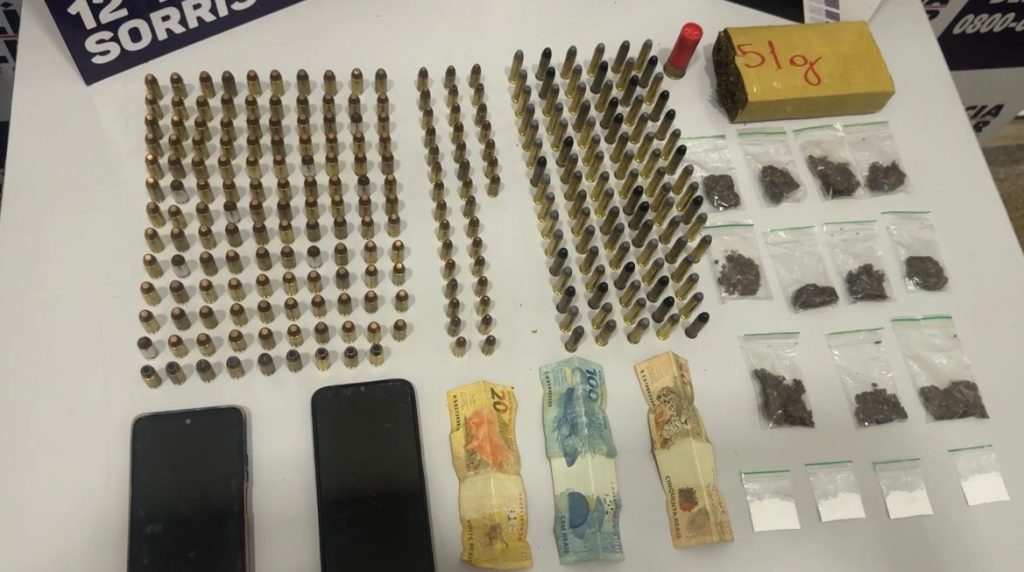 Durante as diligências, os policiais chegaram ao local indicado, onde encontraram um homem e uma mulher. Na residência, foram localizadas diversas munições de diferentes calibres, além de porções de substâncias análogas à maconha e cocaína.