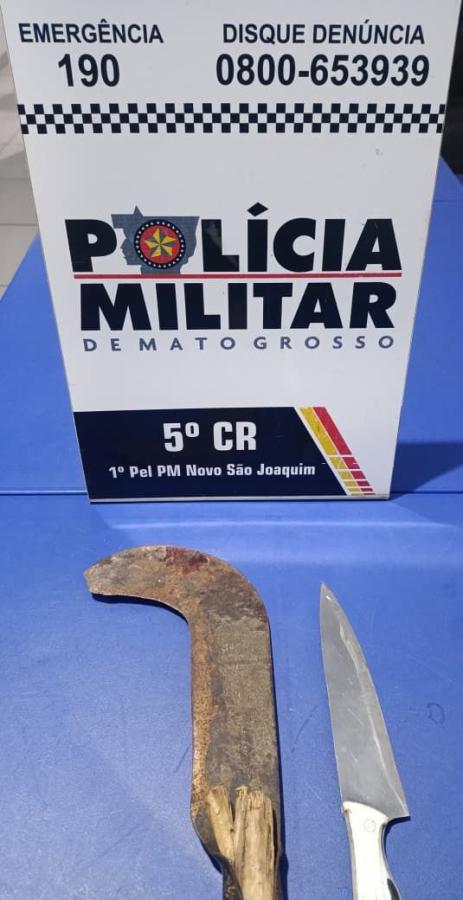 No local da ocorrência, os policiais apreenderam uma faca e uma foice utilizadas na tentativa de homicídio.