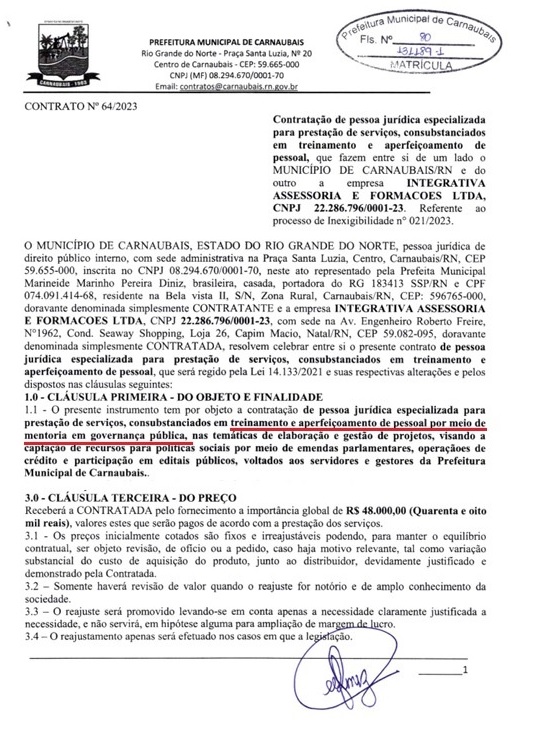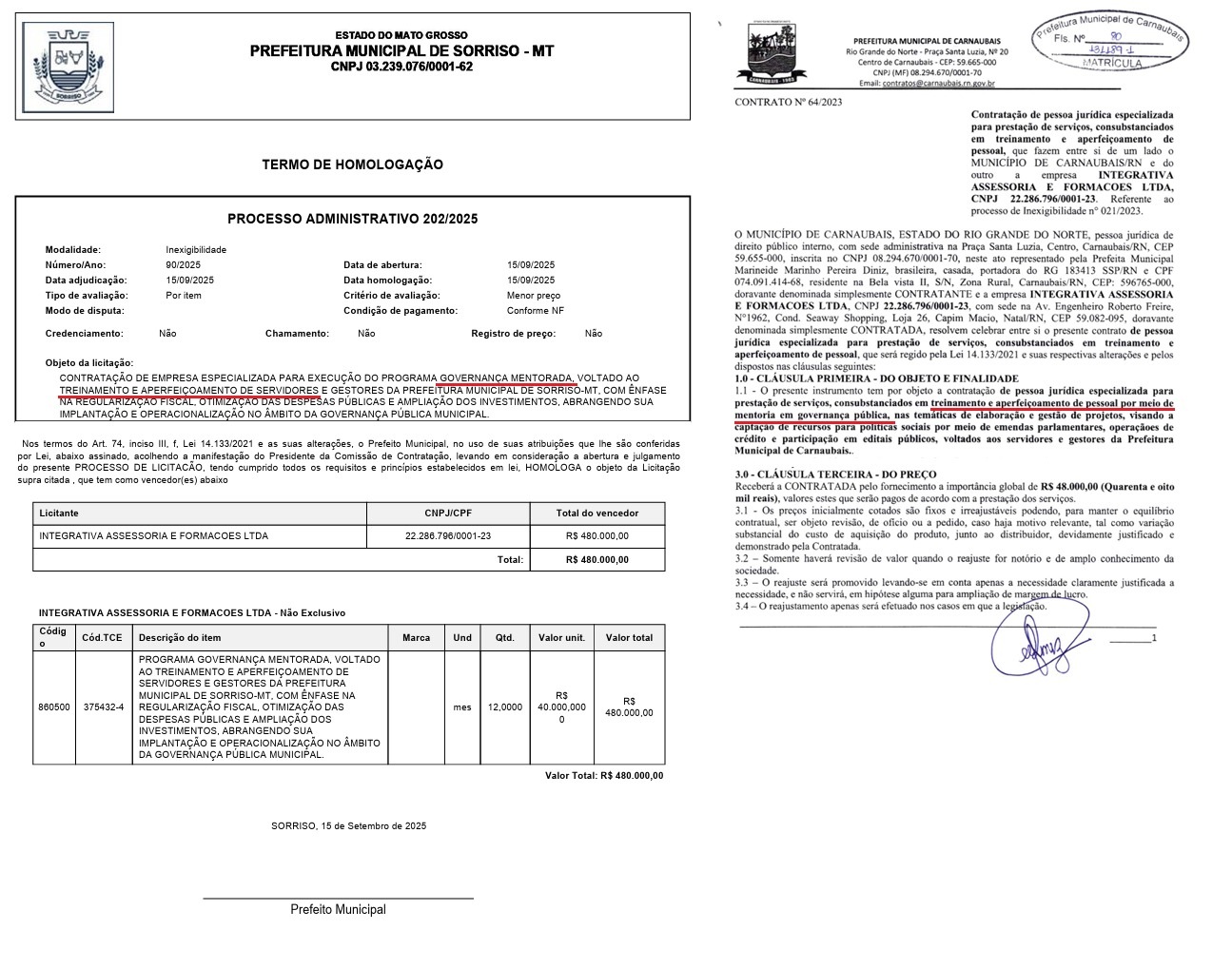 Entretanto, documentos oficiais revelam que a mesma empresa prestou serviços  no município de Caraúbas, no Rio Grande do Norte, em contrato firmado em 2023, pelo valor total de R$ 48 mil — ou seja, dez vezes menor do que o montante homologado em Sorriso.
