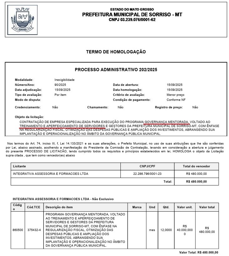 A Prefeitura Municipal de Sorriso homologou no último dia 15 de setembro um contrato no valor de R$ 480 mil com a empresa Integrativa Assessoria e Formações Ltda para a execução do programa “Governança Mentorada”, voltado ao treinamento e aperfeiçoamento de servidores e gestores municipais. O valor será pago em 12 parcelas de R$ 40 mil por mês, durante um ano.