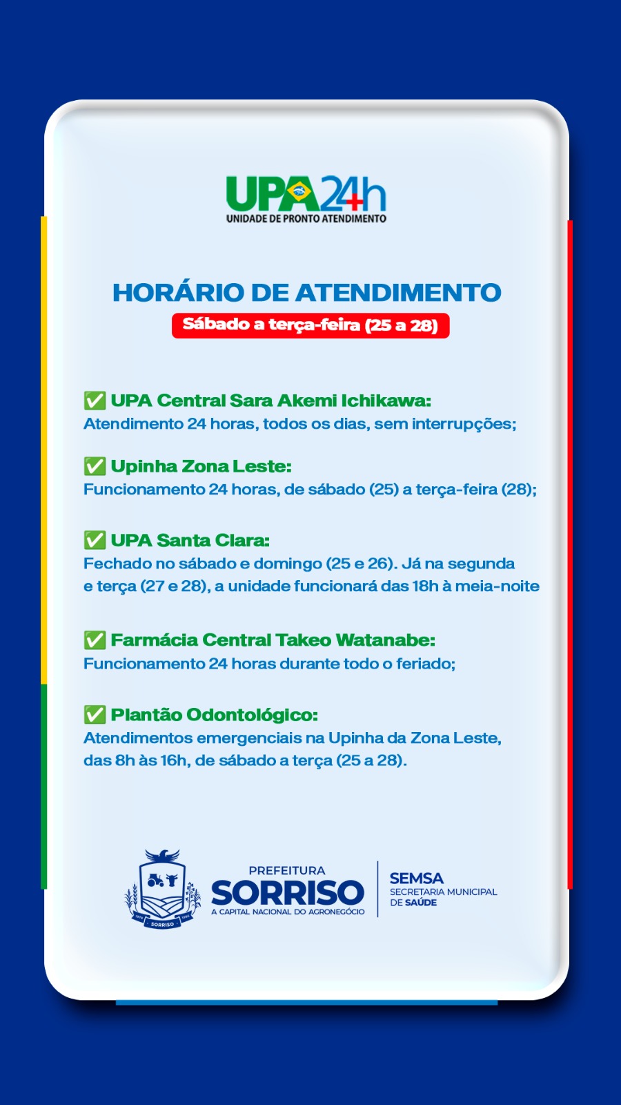 A Semsa recomenda que a população observe os horários de funcionamento de cada unidade e utilize o serviço conforme a necessidade. Para casos leves, a orientação é aguardar o retorno das Unidades Básicas de Saúde (UBSs), que voltam a funcionar normalmente na quarta-feira, dia 29 de outubro.