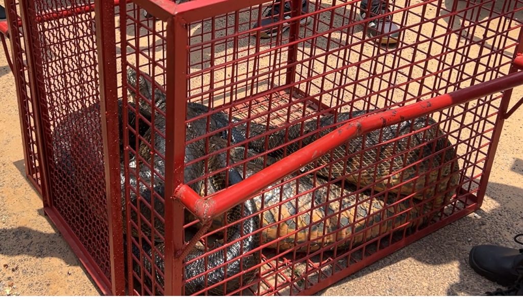 O resgate exigiu esforço extra. “É pesada e grande. Em dois não conseguimos retirá-la da vegetação. Com ajuda de maquinário, removemos os galhos sobre ela e conseguimos colocá-la na caixa de transporte. Ela tem mais de 5 metros e é bem pesada”, relatou Teotônio.