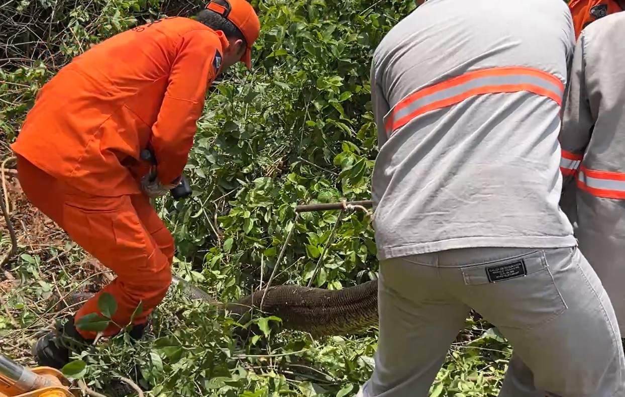 O resgate exigiu esforço extra. “É pesada e grande. Em dois não conseguimos retirá-la da vegetação. Com ajuda de maquinário, removemos os galhos sobre ela e conseguimos colocá-la na caixa de transporte. Ela tem mais de 5 metros e é bem pesada”, relatou Teotônio.