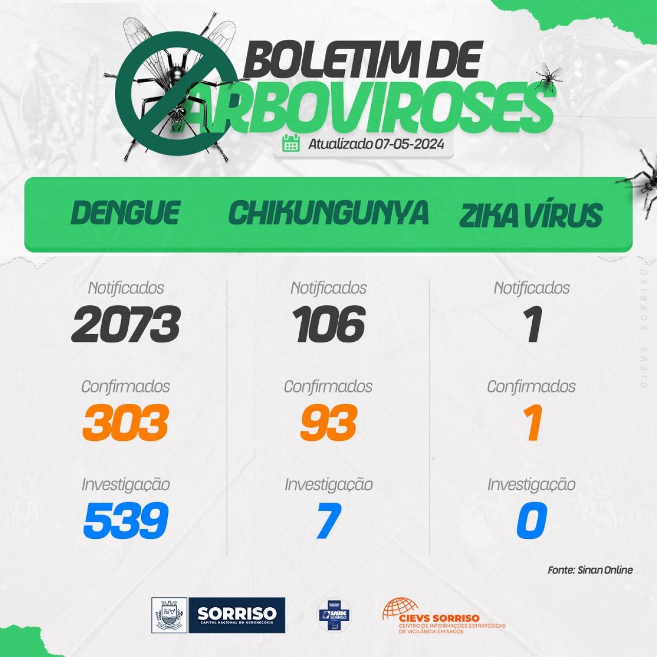 De acordo com o boletim divulgado no dia 7 de maio de 2024, desde o início do ano, Sorriso já registrou 93 casos de Chikungunya, 303 de dengue e um de Zika vírus. Os números mostram um aumento alarmante, com 86 casos de Chikungunya a mais do que no boletim anterior, representando um aumento de 92,47% em menos de um mês. Os casos positivos para dengue também dobraram desde o último relatório, passando de 155 para mais de 300.