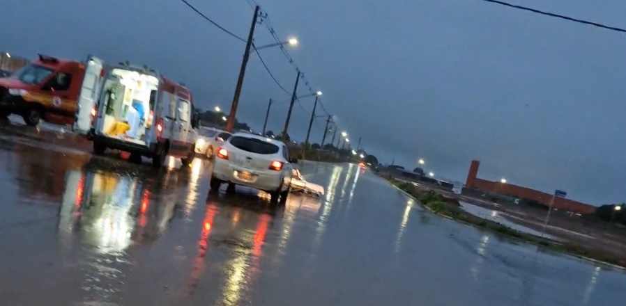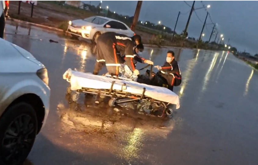 Nesta terça-feira (05), um grave acidente entre uma motocicleta e um contêiner deixou um homem com a perna gravemente dilacerada na rua São José, bairro Industrial. As condições de chuva no momento do acidente podem ter contribuído para a colisão.