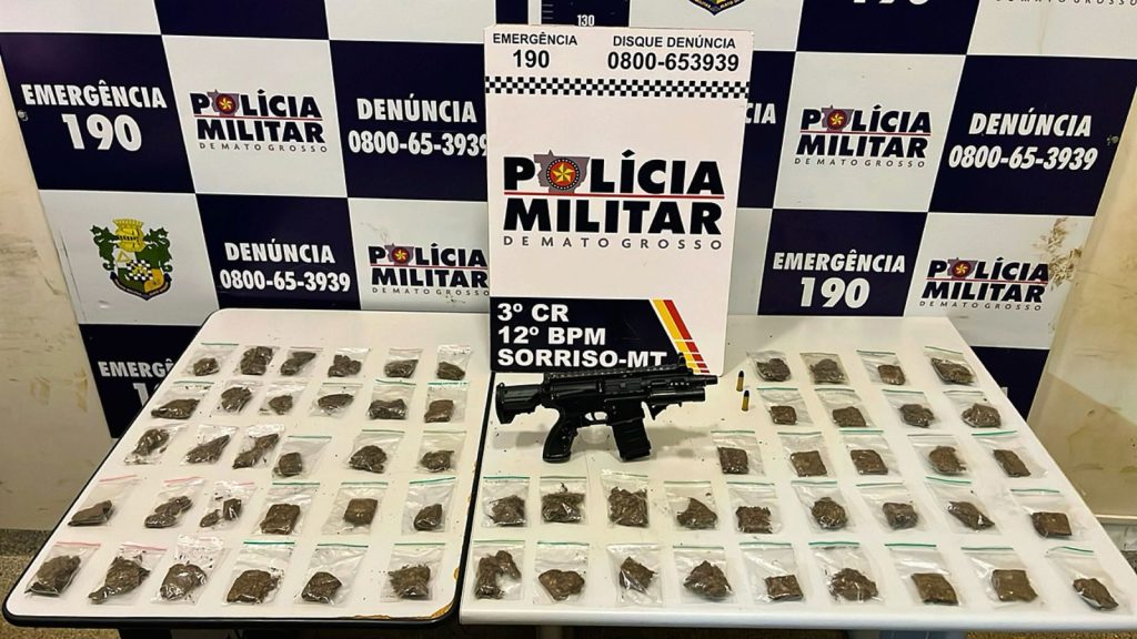 Durante buscas no imóvel, os policiais encontraram 61 sacos zip com substância análoga à maconha, duas munições intactas de calibre .38 e um simulacro de submetralhadora.